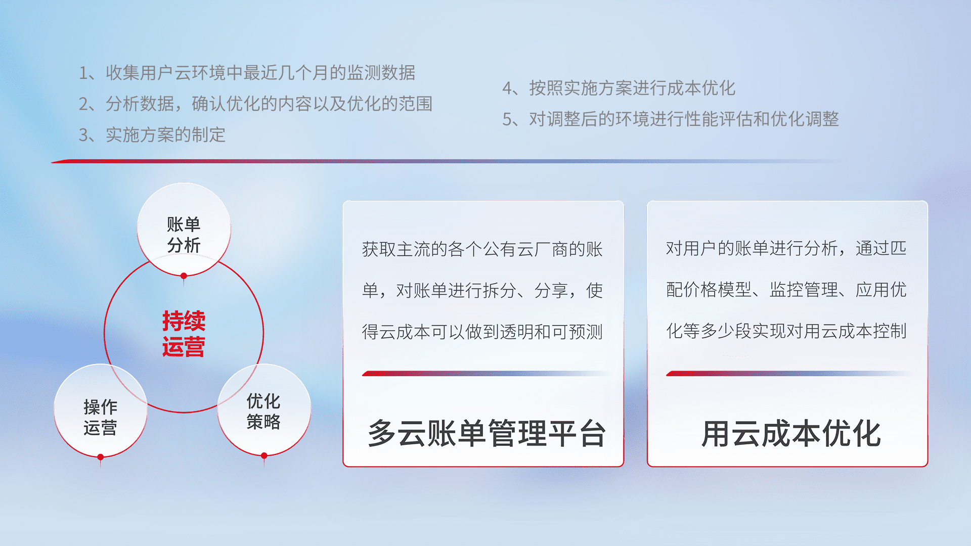 通过多云纳管,,以统一的资源数据模型把客户的云资源进行抽象和封装,,,,进而实现对多云资源的统一操作,,,保障云资源管理的可靠性、、、稳定性与可用性。。量身定制化运维内容,,,配置、、、、开发运维、、、、补丁管理、、、备份、、、监控、、、认证和访问管理、、、审计和日常巡检等,,,,保障在用云过程中的可靠度,,,稳定度以及高可用率。。。