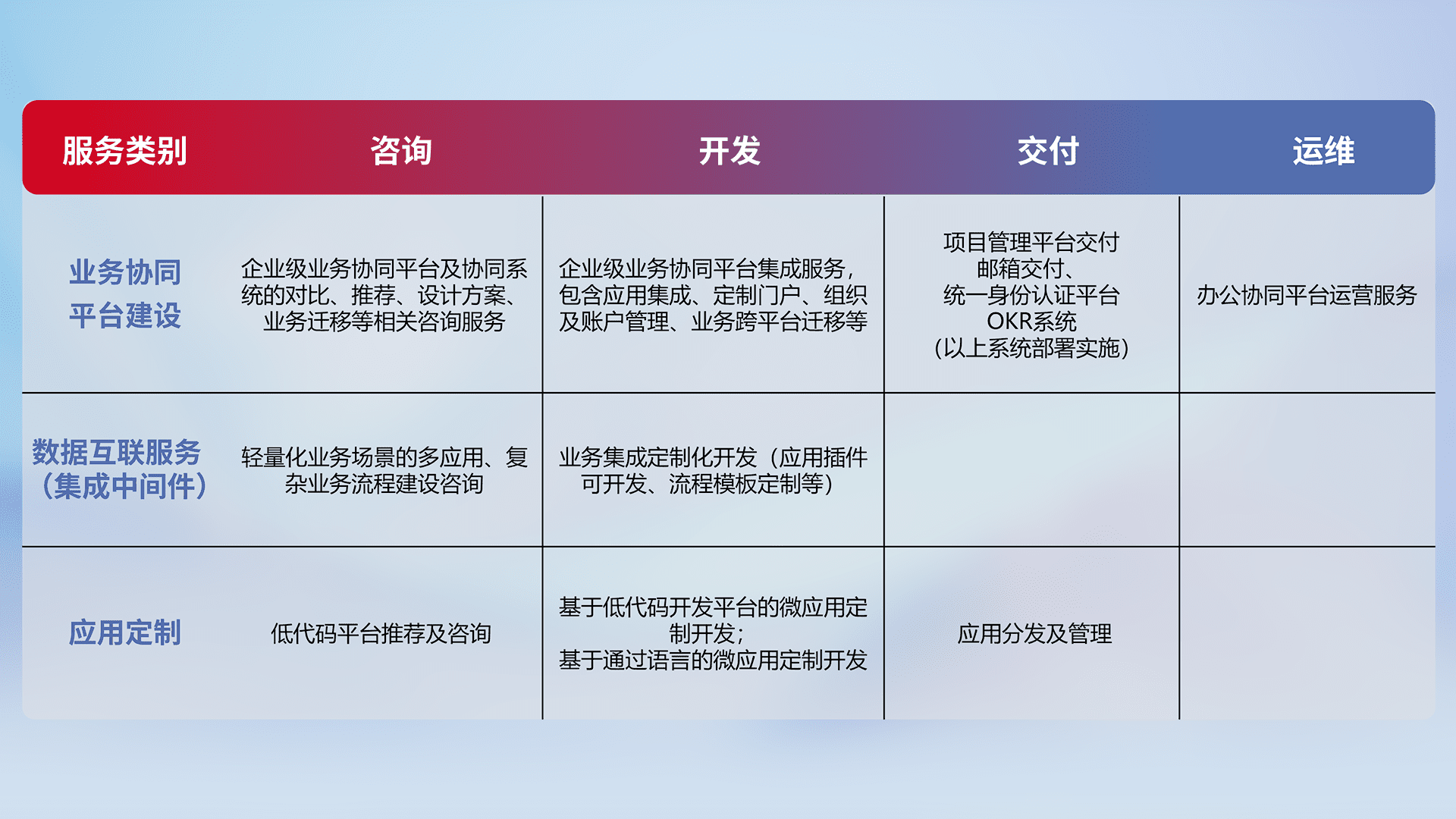 针对钉钉、、、、企微、、IDaas等平台级产品提供产品的规划、、、方案、、、交付、、、、定制化开发等服务,,实现如统一协同办公、、、智能客户服务、、混合会议管理、、智能数据查询、、、、等业务场景,,,,实现数字化转型。。。。